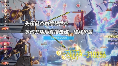 建议①,开局适当削减一半杰帕德韧性条即可,等他后续开启「全体护盾」,此时将其击破可直接解除护盾。其余则是正常消灭属性契合召唤物,全力进攻可可利亚本体。