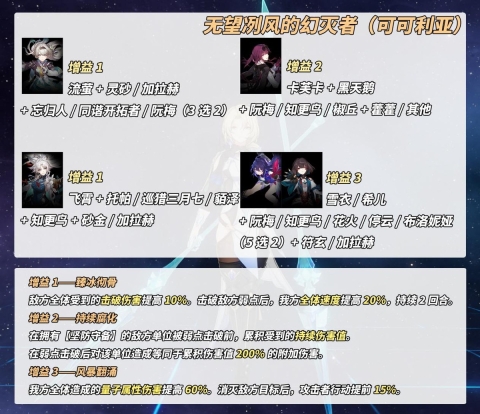 建议②:携带解控或免控队友。可可利亚在两个阶段都拥有较多控制技能,队伍很容易遭受连环控制。从属性层面考虑,可以选用角色“灵砂、符玄、加拉赫”,这些角色能兼顾生存能力与一定的属性削韧效果。