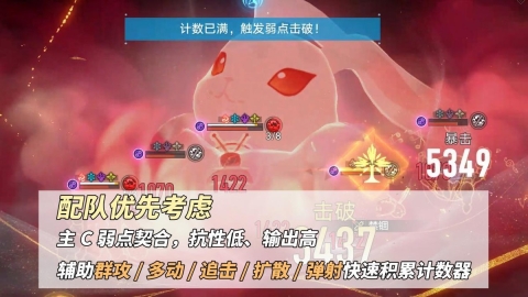 建议①,除了依据弱点属性的契合度来实现快速击破,还可以留意以下类型的角色:群攻、多动、追击、扩散、弹射,通过这些角色能快速积累计数器。所以在搭配辅助角色时,选择攻击性更强或者具有拉条能力的角色,往往能起到事半功倍的效果~