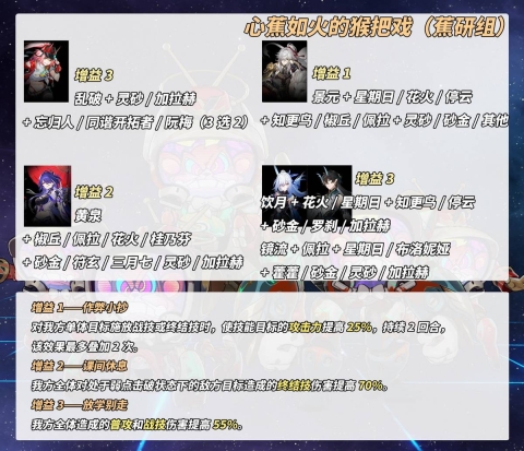 增益3,饮月+花火/星期日+知更鸟/停云+砂金/罗刹/加拉赫。增益3,镜流+佩拉+星期日/布洛妮娅+藿藿/砂金/灵砂/加拉赫。