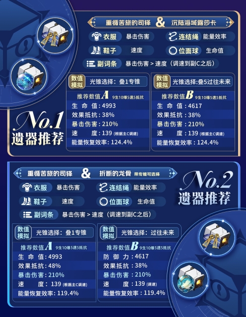 ① 外圈遗器首推【重循苦旅的司铎】,它在提升速度的同时,还能额外给主C提供爆伤加成。要是不携带专锥,内圈遗器建议选择【沉陆海域露莎卡】,其在提高回能的同时,也能提升主C攻击力(注意要把主C置于配队的首位)。要是携带专锥,【沉陆海域露莎卡】、【折断的龙骨】、【不老者的仙舟】这几款遗器都可稳定达成3动1大。